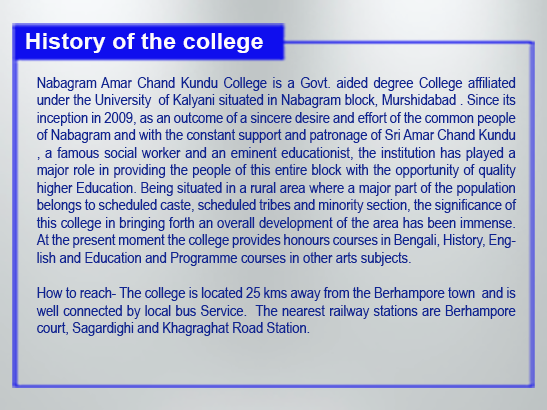 Nabagram Amar Chand Kundu College started its glorious journey from the year 2009, with great potential and immense opportunities. This college is situated at Nabagram in the district of Murshidabad, about 25 km away in the West from its main city Berhampore, in the state of West Bengal in India. It is hoped that this college, harmonizing tradition and modernity, will emerge as a unique institution of higher studies. The college offers undergraduate courses in Arts subjects only. It offers honours in Bengali, History, Education and English; General/Programme courses in Bengali, History, Education, English, Political Science, Sanskrit and Arabic. It is affiliated to the university of Kalyani. The college is named after a great Educationist and Businessman Sri Amar Chand Kundu. Nabagram Amar Chand Kundu College was established with sincere intention to uplift the educationally backward classes and minority communities of the locality by way of promoting higher learning to them. We believe in Swami Vivekananda’s liberal idea that education is not mere accumulation of information but a “life building, man-making, character-making assimilation of ideas” As a Principal of the college, I am committed to an all round development of this college by way of developing a well knit fabric among its faculty members, office staff, students who were and are associated with this college.
